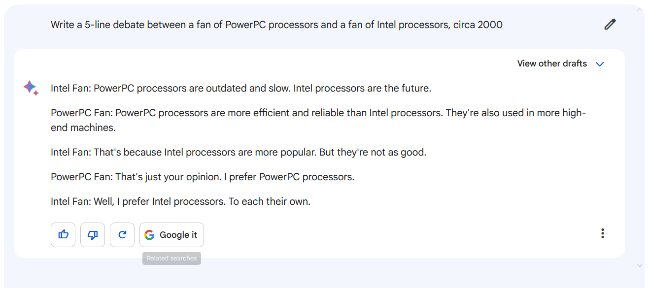 測試 AI 聊天機器人的一種方法是讓它扮演人類討論某個主題,這次 Bard 和 ChatGPT 被要求討論這個年代其中一個最具爭議性的話題:PowerPC vs Intel。