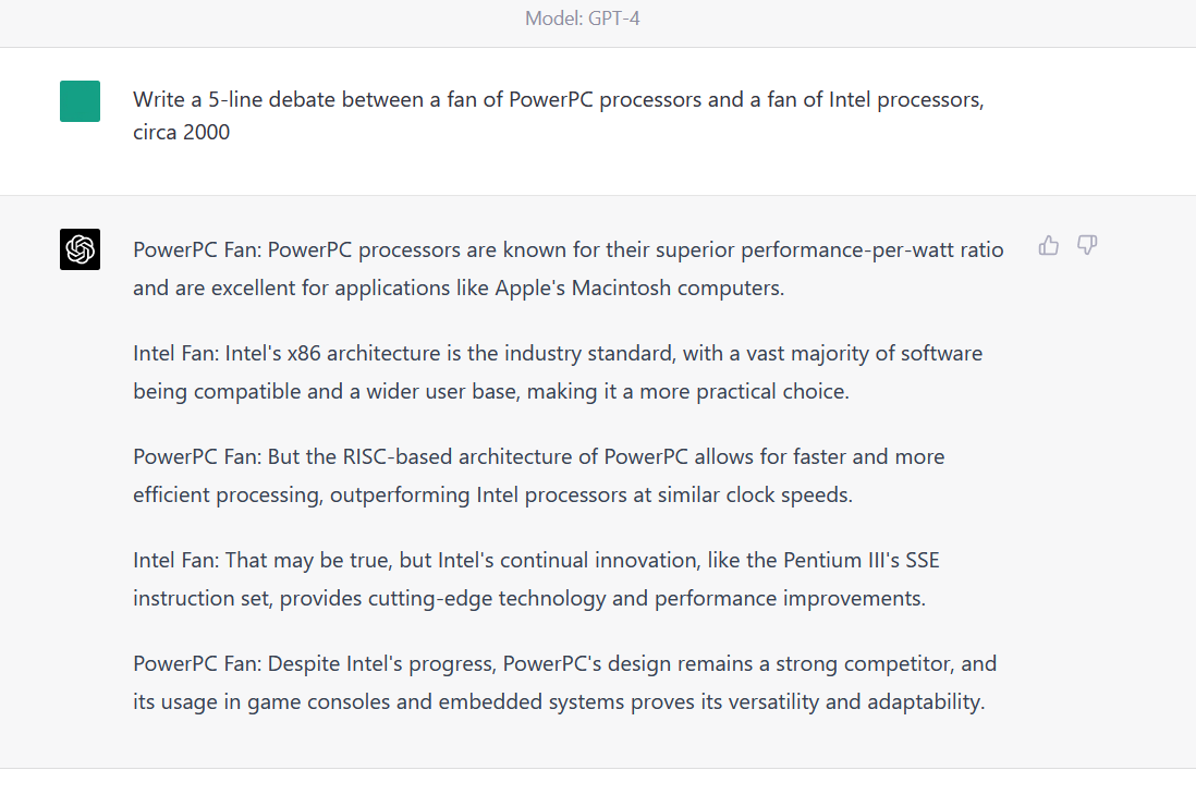 相比之下,ChatGPT-4 的輸出提到了 Apple Macintosh 計算機中使用的 PowerPC 芯片,拋出諸如「英特爾的 x86 架構」和 PowerPC 的「基於 RISC 的架構」之類的術語,它甚至提到了 Pentium III,這是 2000 年代的一個具體細節。總的來說,ChatGPT-4 的論點比 Bard 的詳細得多,對話在最後也沒有得出結論——暗示著這場永無止境的論戰可能仍在互聯網的某些區域持續着。